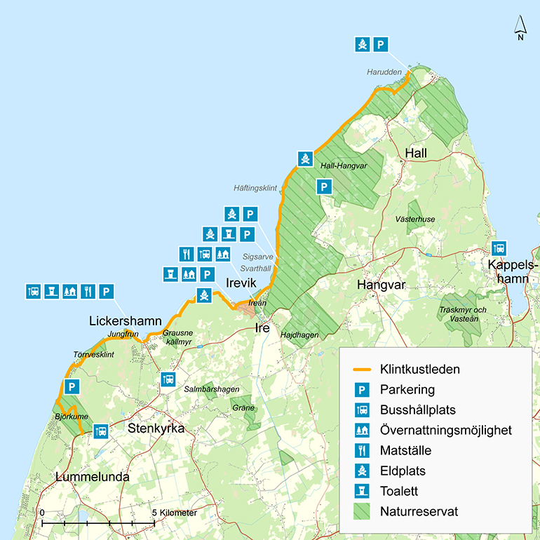 The cliff coast stretches from Björkume Nature Reserve in the south to Hallshuk in the north. Currently, the trail is 30 km long and marked with orange ribbons or washers. The trail ties together six nature reserves. Along the trail there are overnight accommodation and dining options. There are also a number of fixed barbecue places along the route.